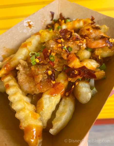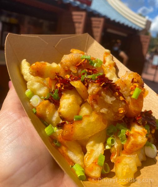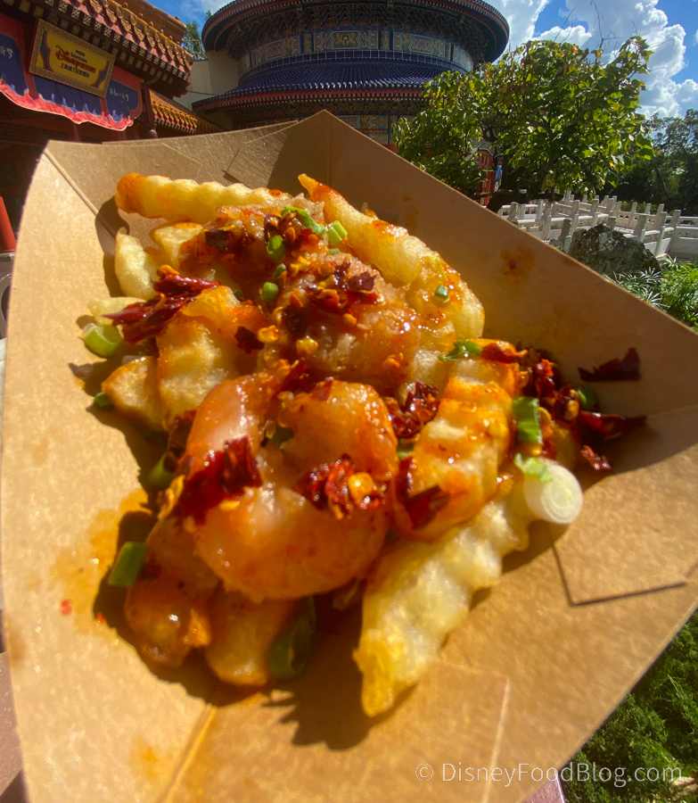 Well, those fries just made their debut at the Food and Wine Festival and they have a twist! A SHRIMP twist. That’s right, the China booth just added Crispy Fried Shrimp, which is Chengdu Street Fries with — you guessed it — shrimp!