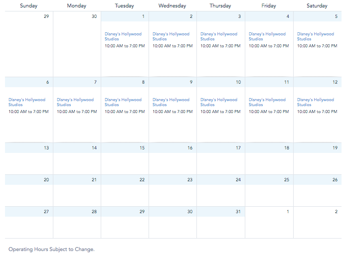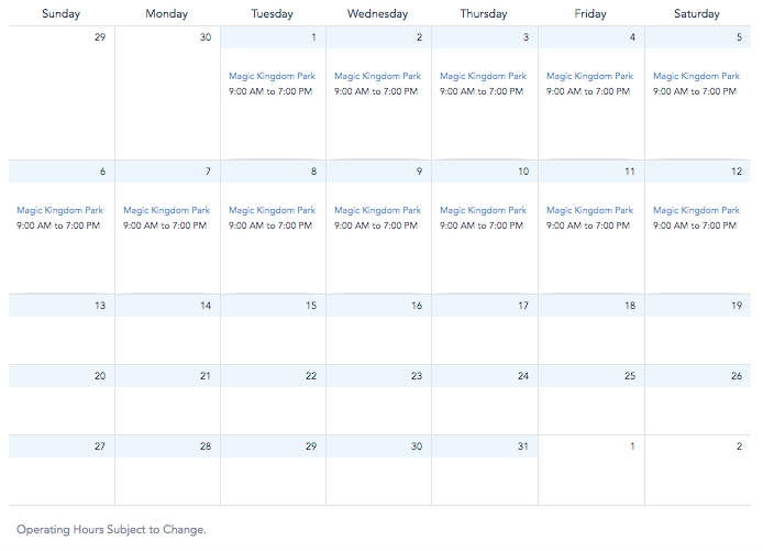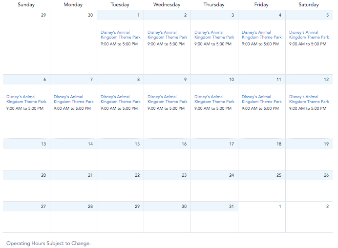And the operating hours for Disney’s Animal Kingdom are listed as 9AM-5PM.