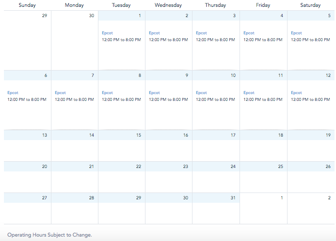 The operating hours for EPCOT are listed as 12PM-8PM.