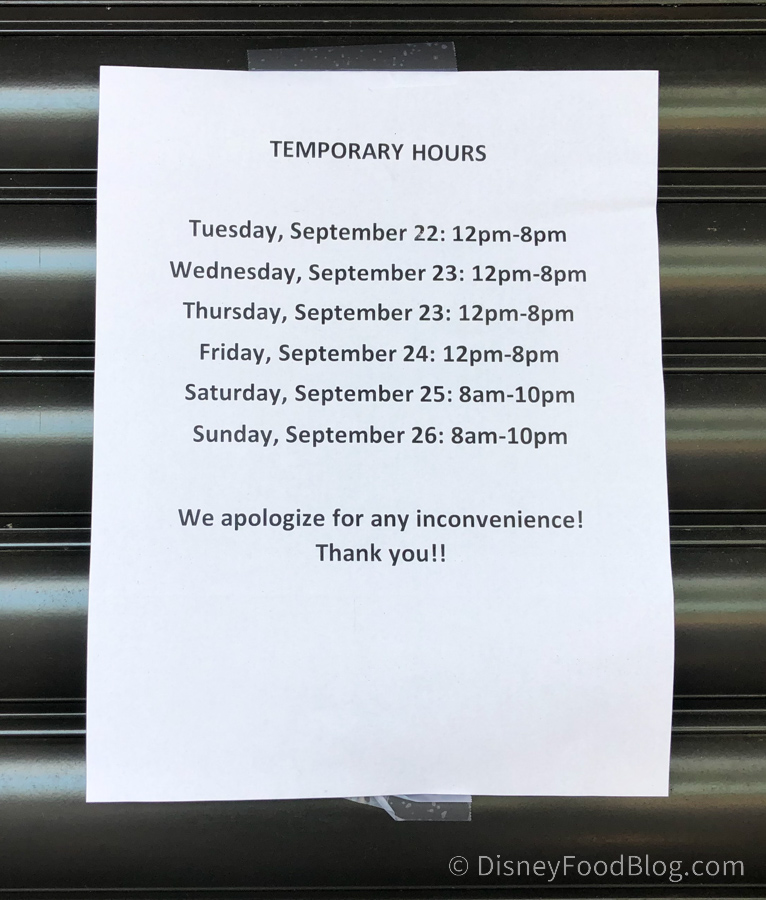 The Starbucks at Disney Springs Marketplace has reduced its hours and was closed when we arrived. There was a sign that told us about the new hours, which are 12PM to 8PM on weekdays, and 8AM to 10PM on weekends.