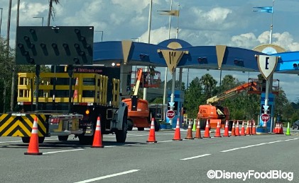 We’ve previously seen some construction on the Magic Kingdom entrance, with construction cones on the left side lanes.