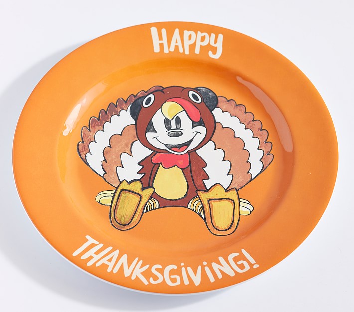 These plates can be found online at Pottery Barn Kids for $9 apiece. And since they’re kid-friendly (BONUS!) you won’t need to worry about something breaking when the family comes over for Turkey Day! Next up is this bright orange Mickey Mouse Thanksgiving charger.