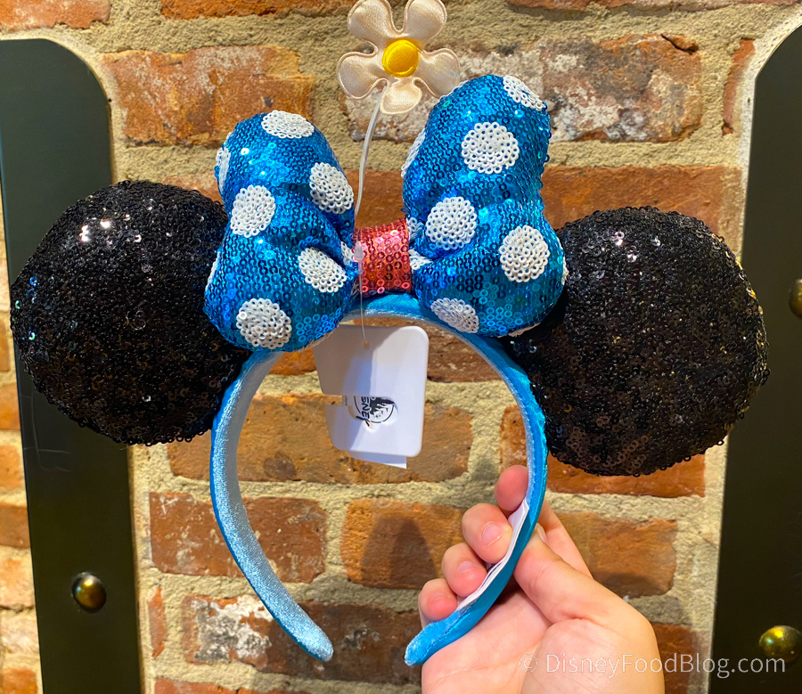 We recently noticed that this Blue Polka Dot Minnie Ear Headband is a sort of revamped design from a previous ear headband we’ve seen. They feature sparkly black ears, a sparkly blue and white polka dot bow with a red band, and a beautiful satin daisy sticking out the top! These ears are also $29.99.