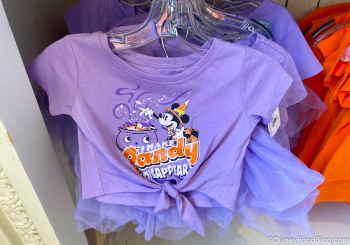 The tied-front top says “I make candy disappear,” with a little Witch Minnie on it and the tutu is a super pretty purple color.