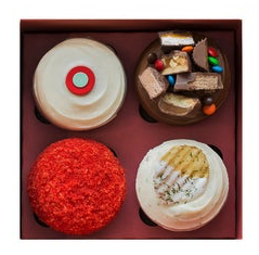 There are two Pregnant AF Boxes available — one with a dozen cupcakes for $69 and one with just 4 cupcakes for $28. The cupcakes included in these boxes are the NEW Pickles & Cream Cheese Cupcake, the NEW Candy Bowl Cupcake (featuring a Belgian dark chocolate cake with dark chocolate frosting, topped with Twix®, Kit Kat®, Snickers®, Milky Way®, 3 Musketeers®, Reese’s® Peanut Butter Cups, and M&Ms® minis — oh. my. goodness.), the Flamin’ Hot Cheeto Cupcake, and the Red Velvet Cupcake. What a mix.