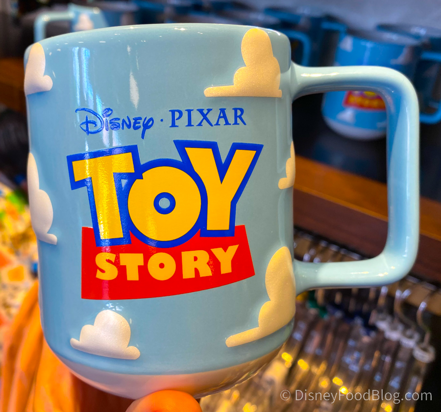 You’ve got a friend in us! We love this Toy Story Mug we found at Mickey’s of Hollywood. It costs $19.99. It’s got the Toy Story logo, along with those classic animated-looking clouds.