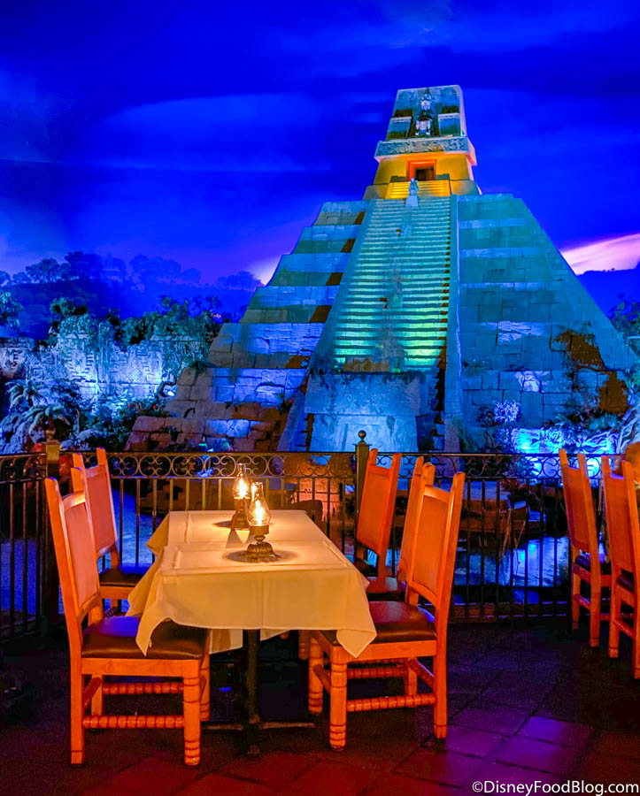 A pyramid rises above the water and as you approach the restaurant itself, which sits on the riverside, you see tables decked out with softly-lit table lamps. We seriously can’t emphasize enough — this restaurant is great to eat at if you love a Disney water ride floating by during your meal and that classic Disney theming.