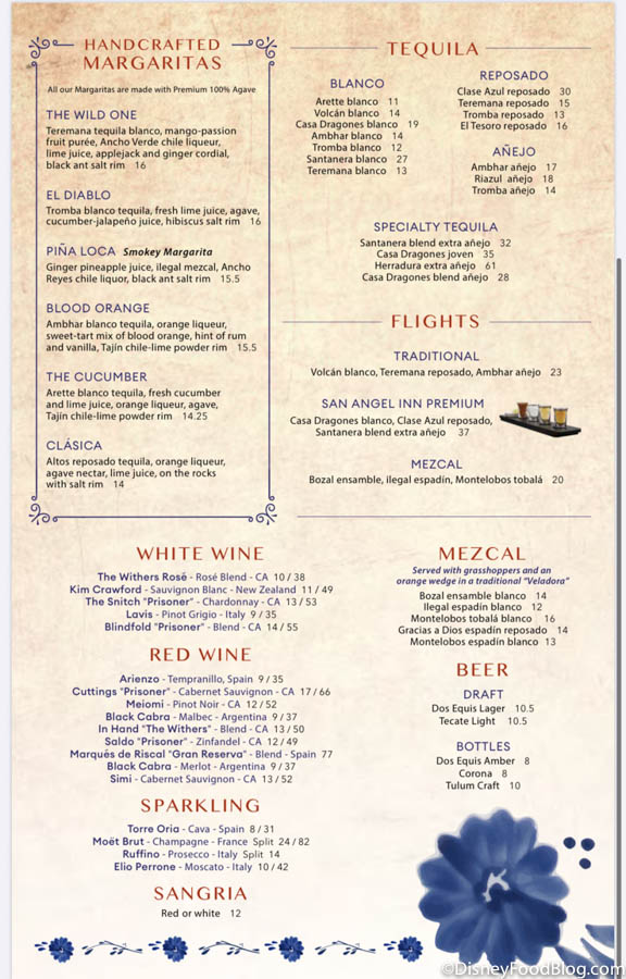 There are also several handcrafted margaritas to choose from, along with tequila, beer, wine, sangria, and Mezcal. San Angel Inn also offers flights of tequila and Mezcal. If you’re a fan of the neighboring La Cava del Tequila, you’ll likely recognize much of the marg menu as drinks straight from their menu. This is a great way to try a few margs without heading into La Cava.