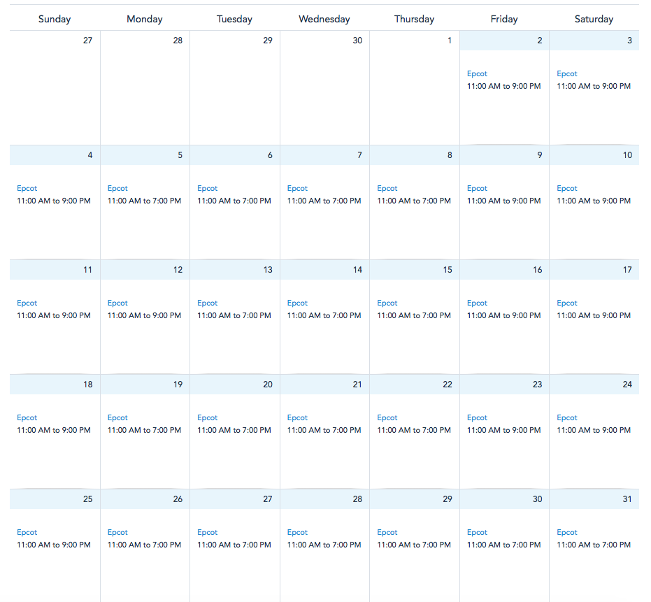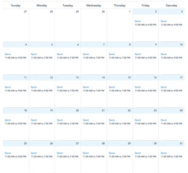 At EPCOT, the park will be open with its extended hours of 11AM to 9PM from October 16th through October 18th and October 23rd through the 25th. The park will also be open with these extended hours from October 2nd-4th and October 9th-12th.