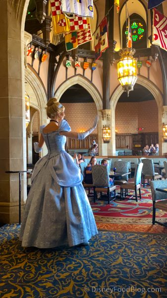 They simply strolled throughout the restaurant, waved, and made their way out. Cinderella also only walks through a small section of the restaurant, so you could end up being far away from her when she walks through. This can be a bit disappointing, especially if you or your little ones were looking forward to having more of a standard character experience.
