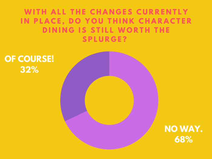 Going to Disney World is expensive enough on its own, and it seems the majority of you felt that adding a character dining experience on top of it, given the current changes in place, simply isn’t worth the extra money.