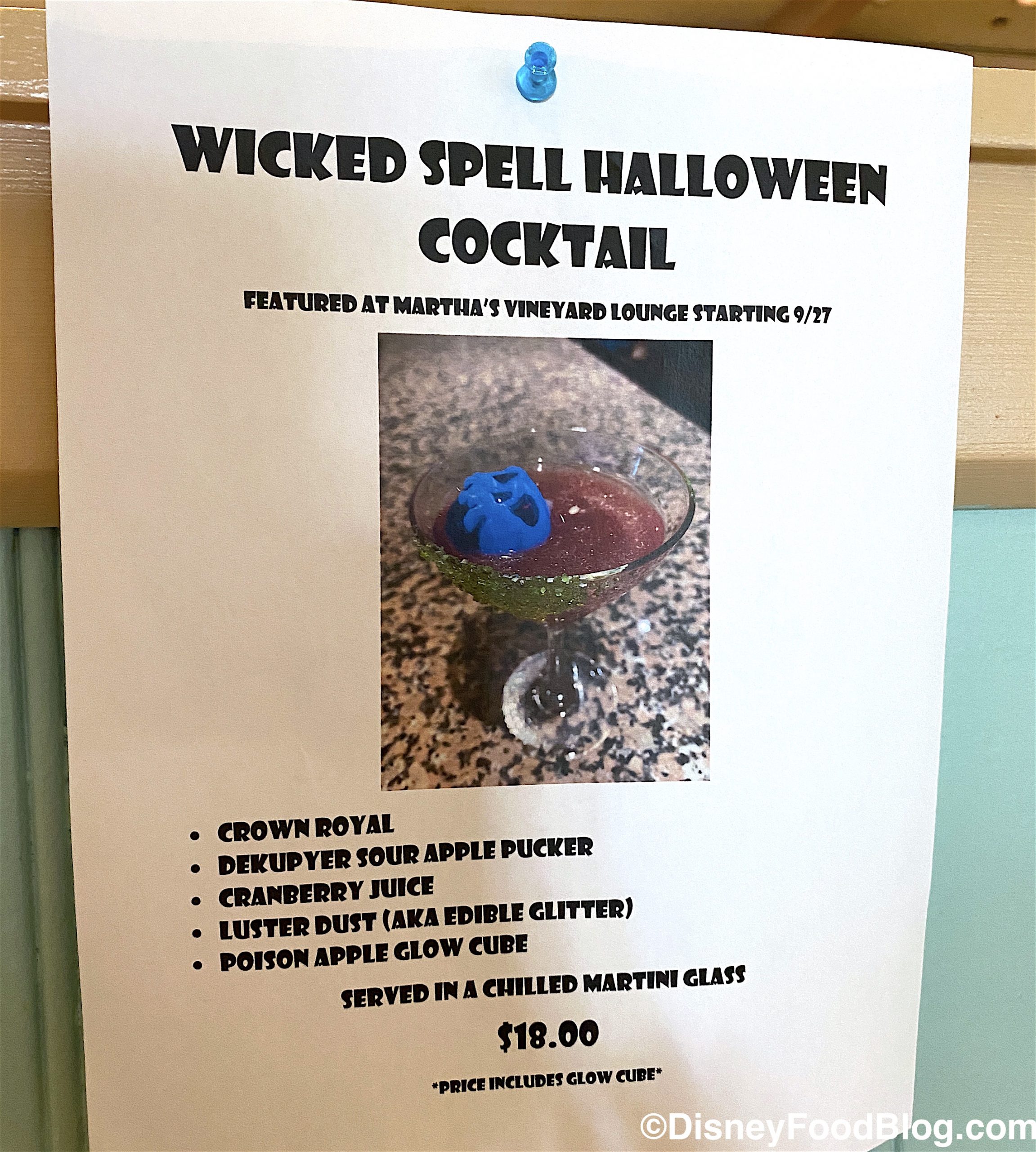 This lounge is serving up a Wicked Spell Halloween Cocktail with Crown Royal, Sour Apple Pucker, cranberry juice, edible glitter, and a poison apple glow cube for $18.