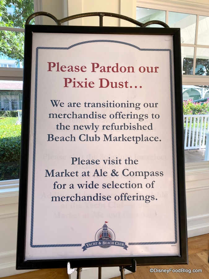 Instead, a sign inside the Solarium informed guests that they are able to stop by The Market at Ale & Compass at the neighboring Yacht Club Resort for merchandise.