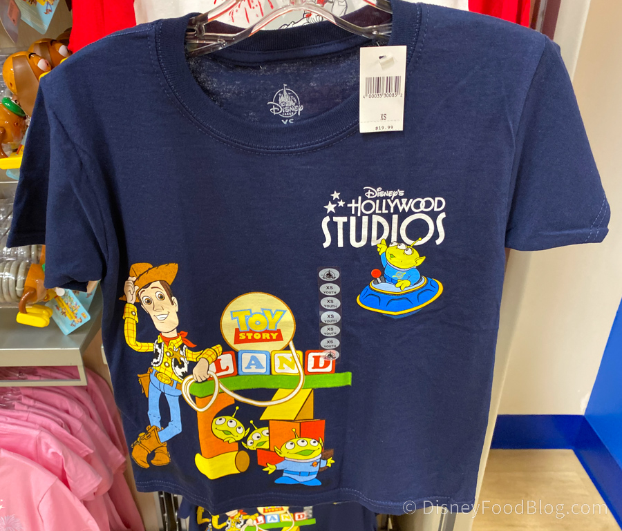 This navy Toy Story Land T-shirt has Woody wrangling up some aliens with the Hollywood Studios and Toy Story Land logos on it. It’s $19.99.