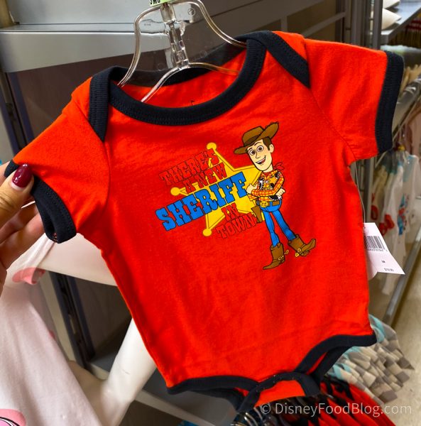 Check out this sweet red Toy Story Woody Onesie for infants! This one lets us know that there’s a new sheriff in town. Indeed! We just hope he doesn’t have a snake in his boot! The onesie is $19.99.