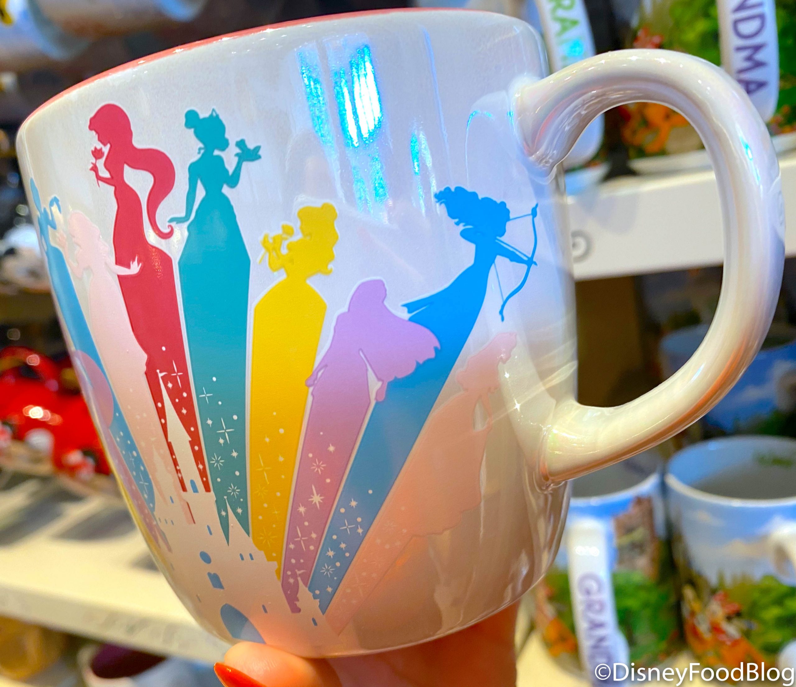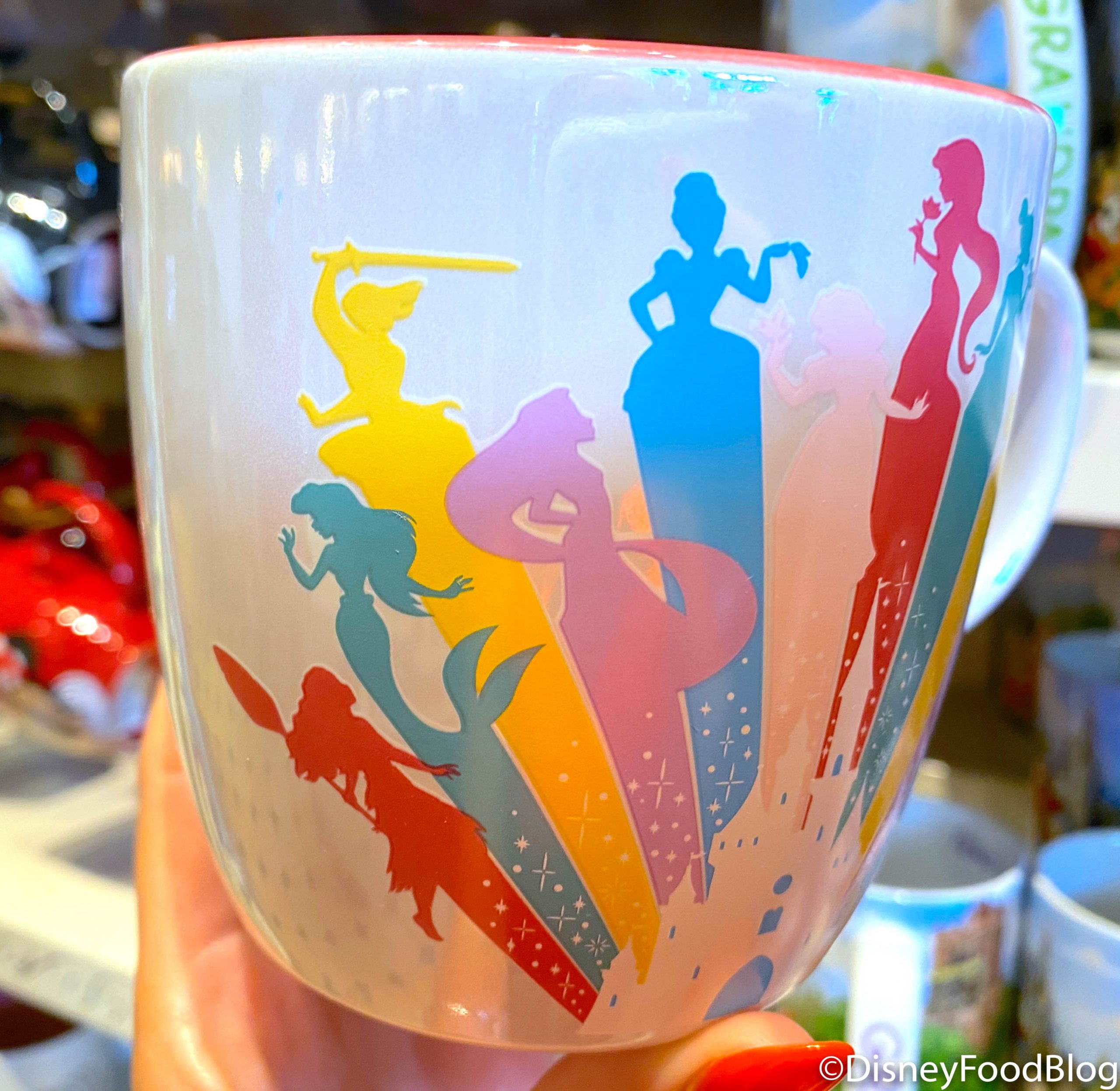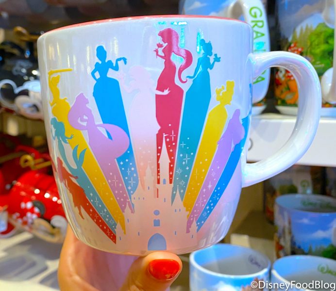 …along with Tiana, Belle, and even Merida in a colorful design on the mug surrounding Cinderella Castle!