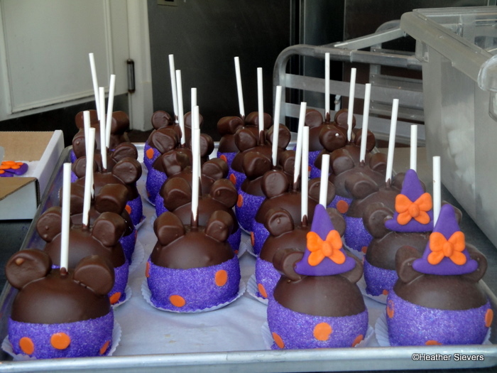 - Minnie Witch Candy Apple – Granny Smith apple dipped in caramel with marshmallow ears, enrobed in milk chocolate, and decorated with a chocolate witch hat, lavender-colored sugar, and orange candy-coated chocolates