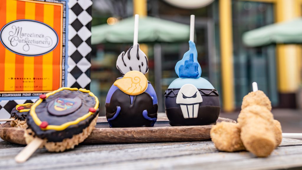 Magic Mirror Crispy Treat, Ursula Candy Apple, Hades Candy Apple, and Cinnamon Marshmallow Wand ©Disney