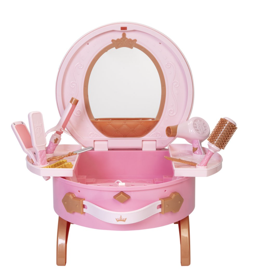 This play vanity set comes with a mirror, brushes, and other hair styling tools! And of course, everything in the set is decorated with crowns, just as a Disney Princess would want!