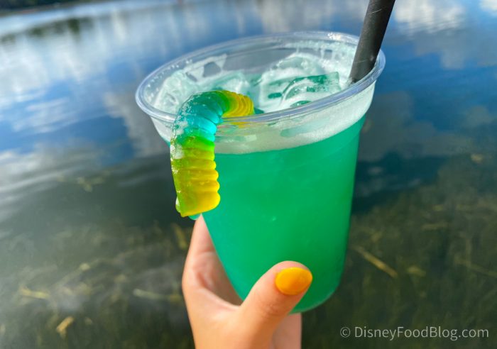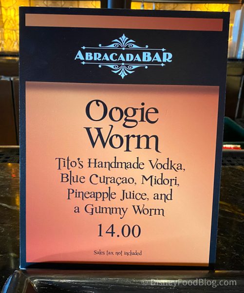 So when we discovered that Abracadabar at Disney’s Boardwalk Resort had a new drink called the Oogie Worm, we had to try it! This drink is mixed with Tito’s handmade vodka, blue curaçao (shocker…Disney loves blue curaçao, y’all), Midori, pineapple juice, and a gummy worm.