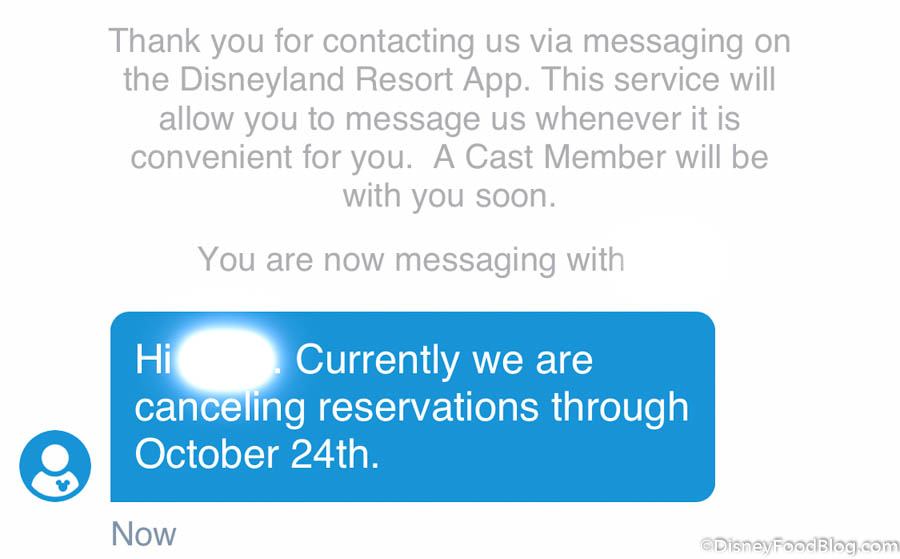 We reached out to a Cast Member through the Disneyland Resort App to ask about the current round of cancellations. She told us that Disneyland reservations are currently being canceled through October 24th.