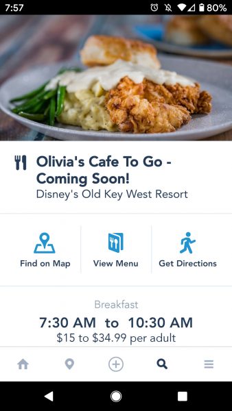 That restaurant is Olivia’s Cafe at Disney’s Old Key West Resort. When we pulled up the My Disney Experience app this morning to take a peek, we noticed a new listing under Dining that included Olivia’s Cafe To Go. And it says, “Coming Soon!”