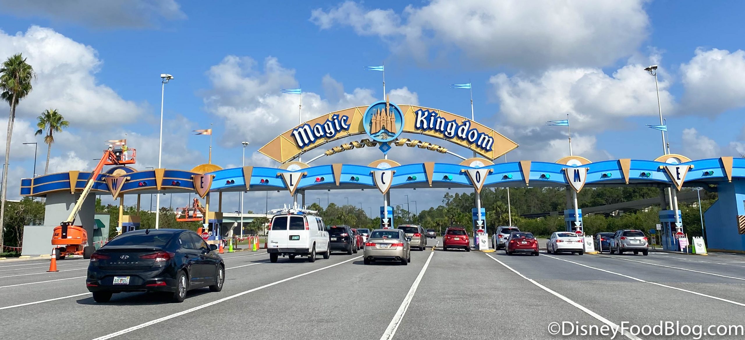 You know the sign we’re talking about — the classic entrance you drive under as you head to the most magical place on earth! Here’s what the sign looked like earlier this year, after the parks reopened.