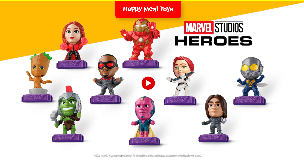 You can try your luck at a McDonald’s near you and see what Marvel toy you get. Each Happy Meal at participating McDonald’s locations will have one Marvel toy in them for a limited time while supplies last. There are a bunch of different ones including Winter Soldier, Black Widow, Scarlet Witch, Falcon, Groot, and Hulk! Just look at how cute Groot is!
