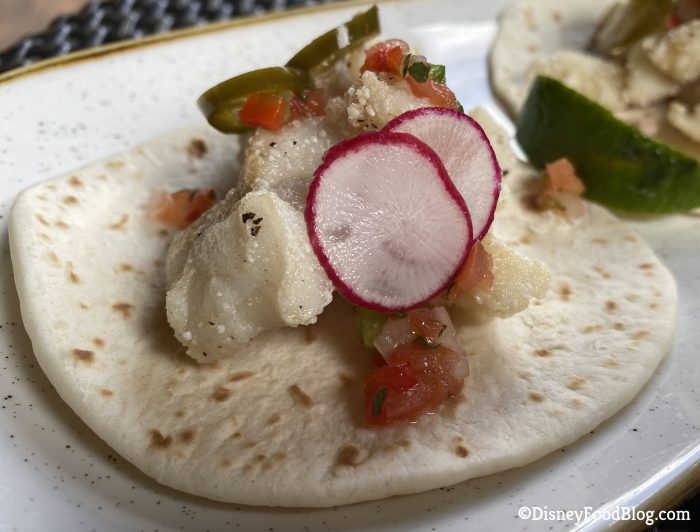 The Fish Tacos feature sustainable fish topped with pico de gallo, pickled jalepeño, and radish. Wanna take a closer look?
