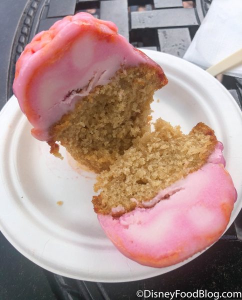 We thought the treat might be filled with raspberry on the inside, but it isn’t. Instead, the raspberry is only on the top of the cupcake. The raspberry added a really nice, fresh flavor to it so we definitely wish we could have gotten more of that.