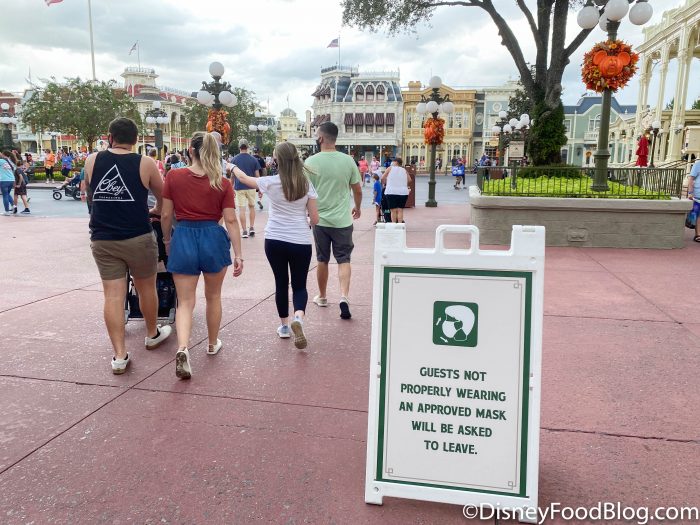 Today, we spotted a NEW mask-related sign in Magic Kingdom. This sign specifically notes that “Guests not properly wearing an approved mask will be asked to leave.”