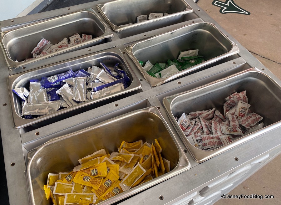 In addition to pretzels (you’ll also find the classic Mickey Pretzel up for grabs here), The Lunching Pad serves two entrée options: a Pulled Pork Sandwich and a Hot Dog, for which you’ll find a few condiments available.