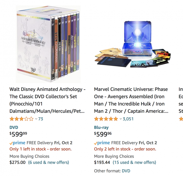 You can be the proud owner of a Walt Disney Animation DVD box set or a HALFWAY COMPLETE Marvel Universe Blu-Ray set for the low, low price of $600. *record scratch* Um…hold up. We have so many questions! Who buys DVDs still in the age of Blu-Rays?? (Ok ok, we know you CAN watch DVDs in a Blu-Ray player.) And why would you spend $600 when you can watch all these movies on Disney+ for a couple bucks a month? AND why does this Marvel set come in a glowing collector’s case that looks like it was made in 2004?