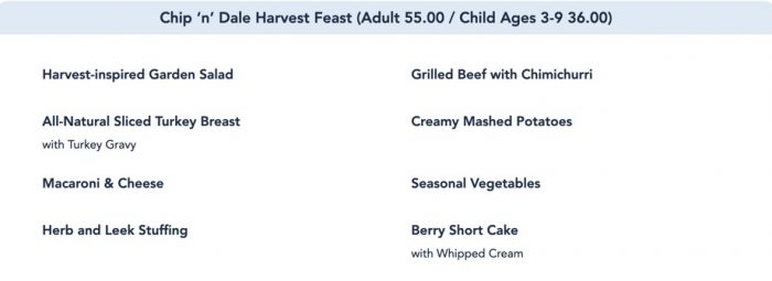 The full Chip ‘n’ Dale Harvest Feast comes with plenty of meat, veggies, and CARBS to chow down on while you visit with the characters during lunch or dinner.