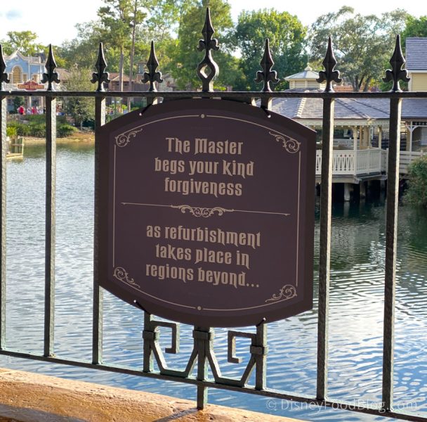 How cool is that? The only thing is…this sign has nothing to do with the Haunted Mansion (and believe us, we nearly freaked out when we first saw it!). We spoke to a Cast Member who told us that this is actually regarding the refurbishment of the Liberty Square Riverboat.