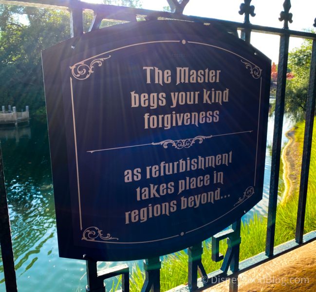The Liberty Square Riverboat and Tom Sawyer Island are undergoing refurbishments right now. To inform guests of the refurb, Disney has installed these adorable signs at the Haunted Mansion, apologizing for the noise and construction across the river.