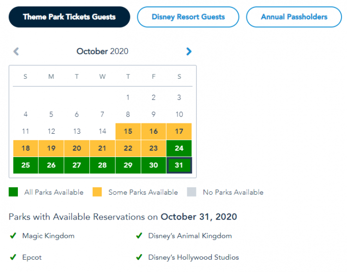 Theme Park Ticket Guests Park Pass Reservation Availability for Halloween as of October 15th © Disney