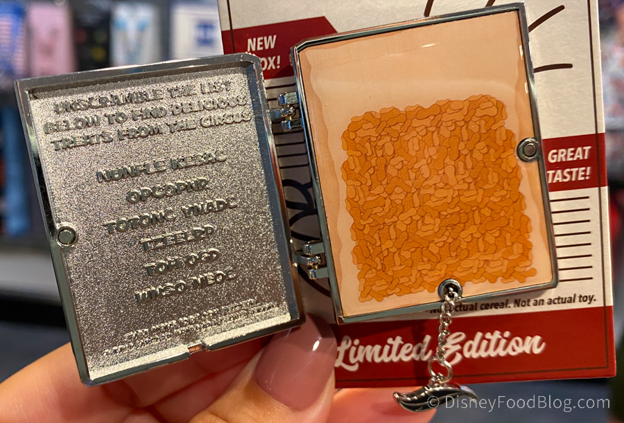 Each pin has a little game inside it. In case you can’t read it, it says, “Unscramble the list below to find delicious treats from the circus.” It’s a word scramble game! This pin is $17.99.