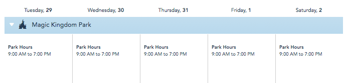 The operating hours for Magic Kingdom during these dates are currently scheduled for 9AM-7PM.