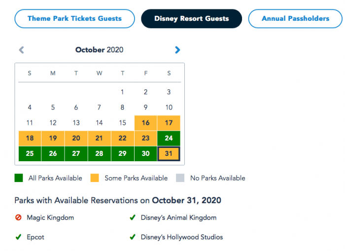 Theme Park Tickets Guests Park Pass Reservation Availability for Halloween as of October 16th © Disney