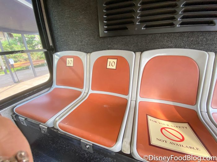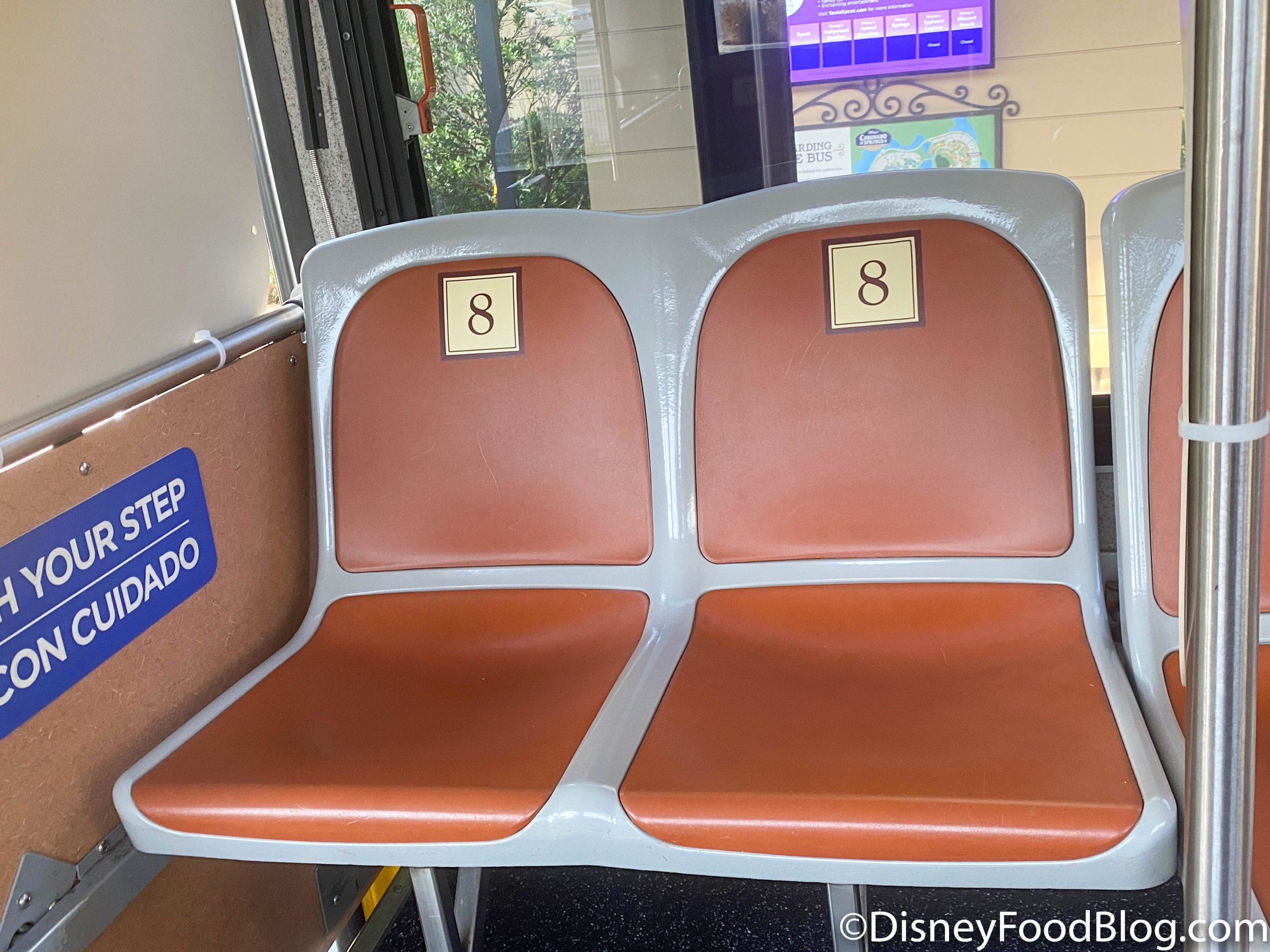 When Disney World reopened, we got to experience the new bus loading and seating process — no more filling in every available spot or standing up and holding on to those hanging black handles! But, when we rode on one Disney bus today, we noticed some things have changed.