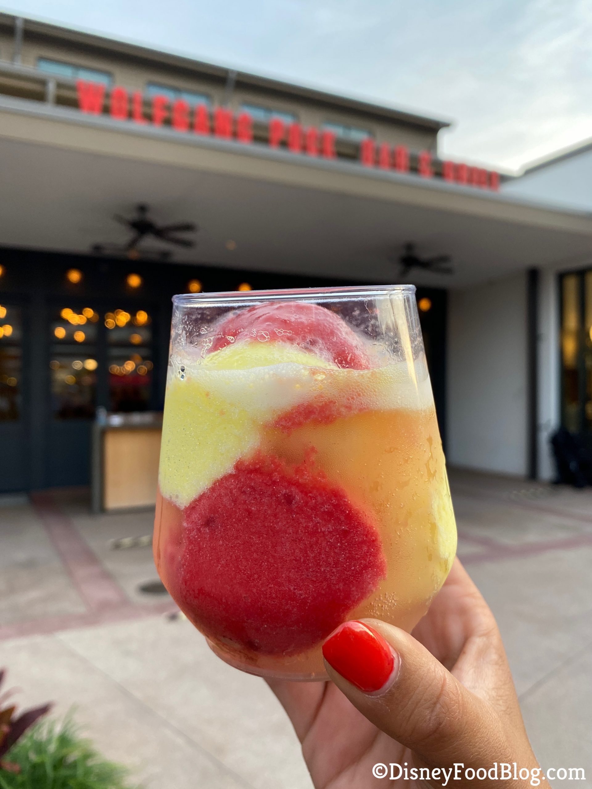 As we were strolling and shopping through Disney Springs, we noticed something on the menu at Wolfgang Puck Bar & Grill…sorbet spritzers! These new concoctions are made with sorbet and either Prosecco or Moscato d’Asti.