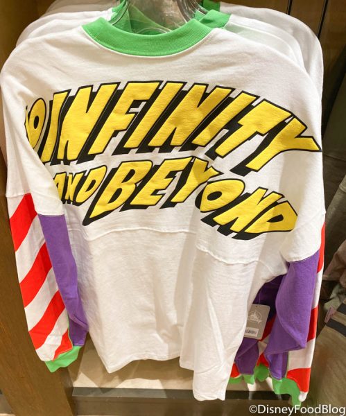 We were strolling through World of Disney in Disney Springs when we spotted the super-snazzy Buzz Lightyear Spirit Jersey and yes, it is as cool in person. The back says “To Infinity and Beyond” in a neat font…