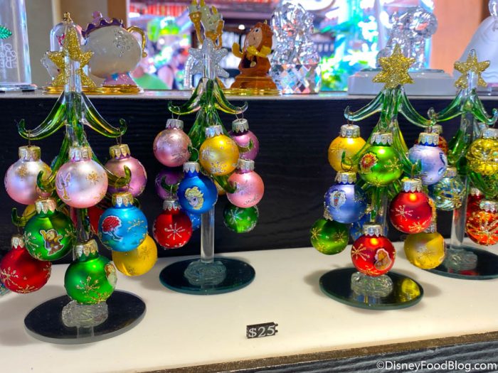 At Arribas Brothers — La Princesa de Cristal, the cart in Adventureland, we spotted some cute Christmas decorations. This spot has crystal Christmas trees that feature Disney characters. They’re not new, but we’re feeling Christmasy today! The character ones are $25 and the ones without characters are $17.