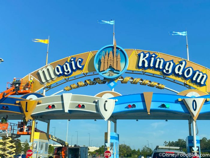 As for construction, we checked in on the progress at the Magic Kingdom entrance sign. They started painting the “M” of Magic Kingdom in the base coat. We can’t WAIT to see the finished product!