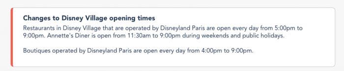 So, while this curfew won’t impact the hours at either of the parks, it will impact the operating hours of the stores and restaurants in Disney Village, the Resort’s shopping and dining district. The restaurants in Disney Village that are operated by Disneyland Paris will be open from 5PM-9PM daily. The boutiques operated by Disneyland Paris will be open from 4PM-9PM daily.