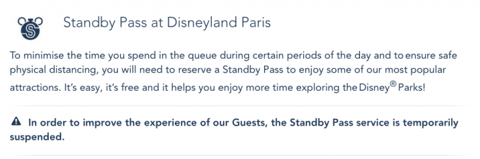 On the Disneyland Paris website, it notes that the Standby Pass is suspended so they can “improve the experience of our Guests.”