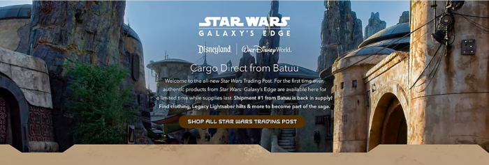 The Galaxy’s Edge page was set up to promote Disney’s recent decision to bring Star Wars: Galaxy’s Edge merchandise into Disney Springs and online. This is the first time any of this merch has been available outside of Batuu.