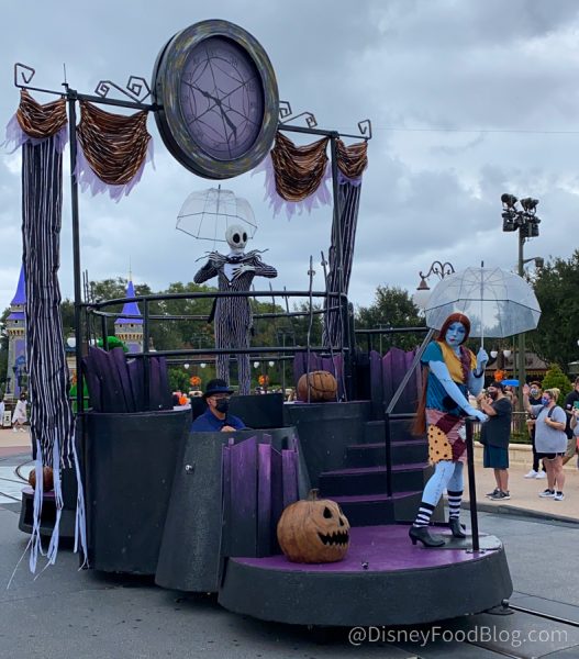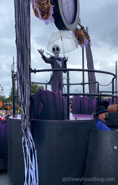 But today’s Rainy Day Cavalcade was a little bit different! The Nightmare Before Christmas float came out, and some of the characters on it had a small addition to their wardrobe — they were carrying clear umbrellas!