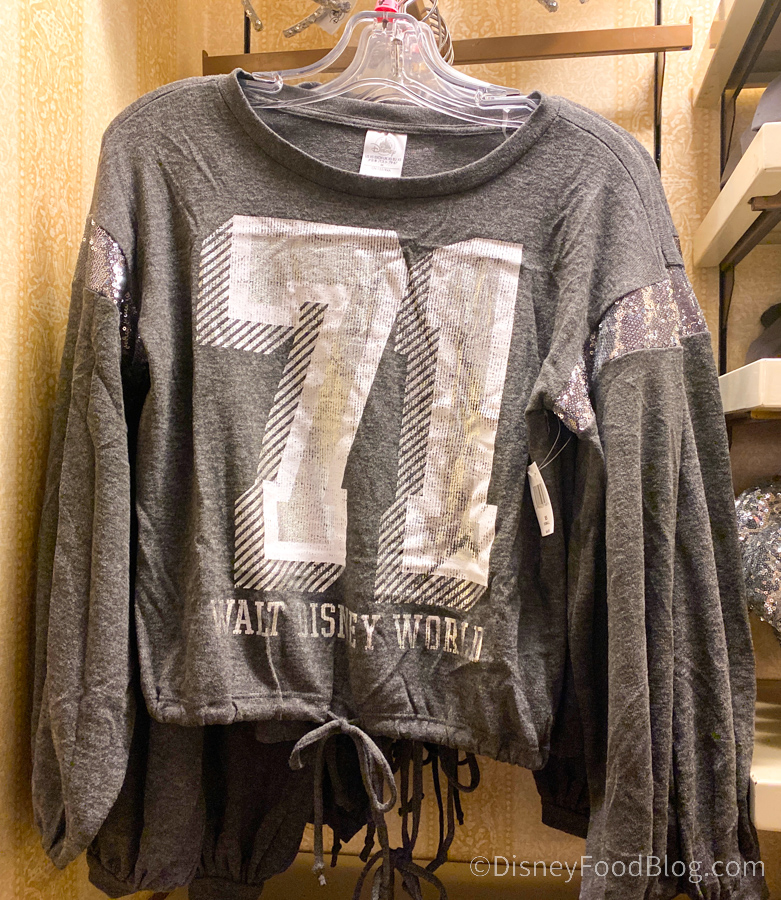 The best part of this collection is that it’s all comfort wear, like this Relaxed Tie-Front/Cinch Waist Sequin Sweatshirt that has subtle sequin stripes on the sleeves. The sweatshirt, which is $44.99, also has ’71 on the front, in honor of the year when Disney World first opened.